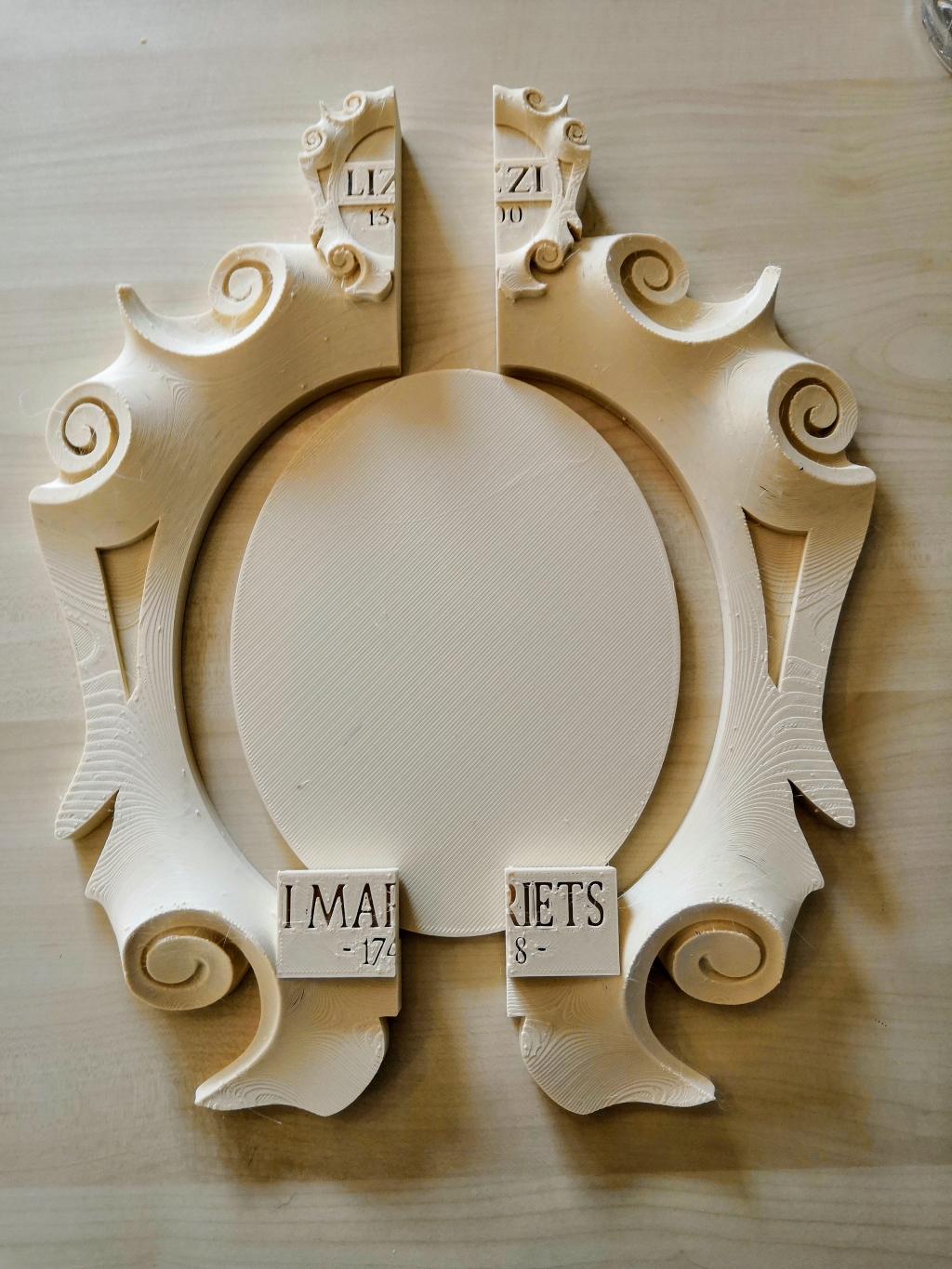 Per una resa migliore dei dettagli e per facilitare il compito di stampa, abbiamo preferito suddividere il nostro modello in 3 parti principali: le due ali della cornice e l’anima centrale.