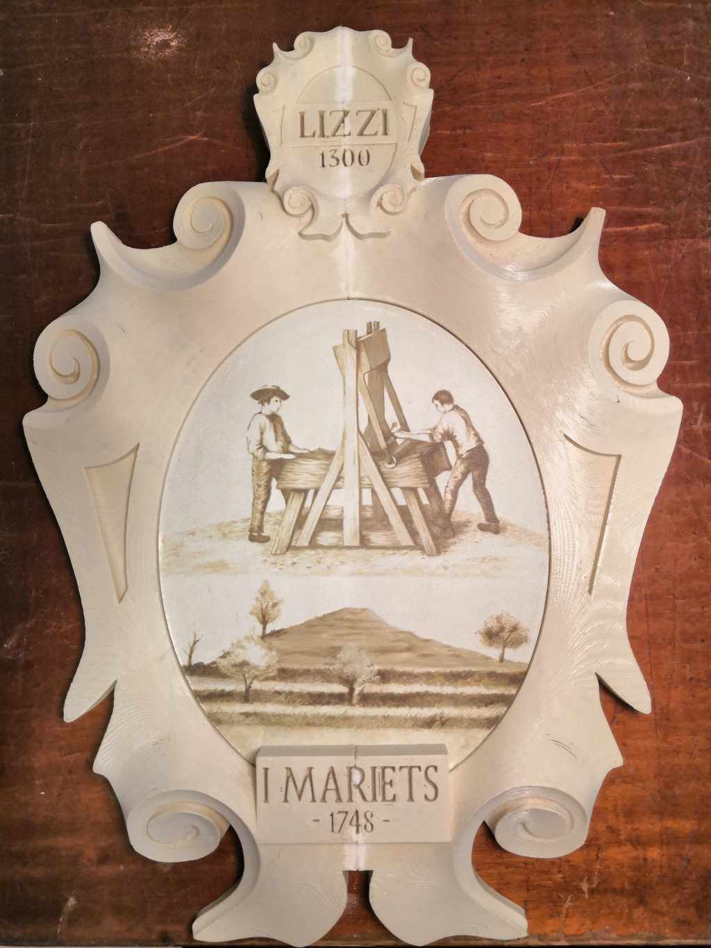 A fine ’800 i membri della casa supereranno il numero di 50 persone. È questo porta alla divisione in due rami familiari: i Marièts che andranno ad insediarsi in borgo Paludo ed i Marièts che si stabiliranno in borgo Riolo. L’Origine del cognome Lizzi” secondo alcune ipotesi  deriva dalla parola friulana “liz”, termine usato dai tessitori medioevali; questo ci porta all’ultima raffigurazione dello stemma, ovvero due artigiani intenti ad usare una cardatrice. Questo macchinario permette di “battere” la lana e liberarla dalle impurità e rendere parallele le fibre in modo da facilitare le successive operazioni di filatura.